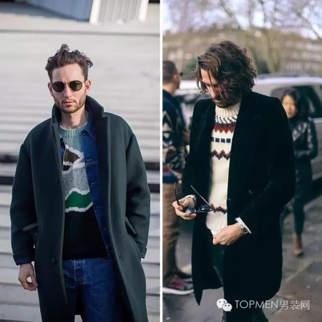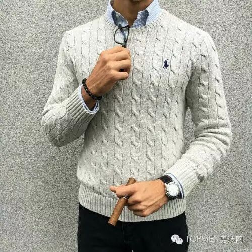 如果说上面是经典不出错,那么搭配绞花毛衣或者粗针织时髦度就更上一层楼,只要衣服是合身款的,一定让你成熟男人味爆表。