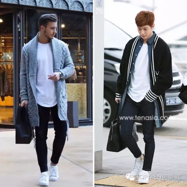 不只是短款,长款如今也很受潮人的喜爱,15~20℃白T套一件长款针织就刚刚好,然后一条窄腿黑牛仔一双小白儿就够潮够有范儿,适合年轻潮人,不过还是高个子穿会更好看。