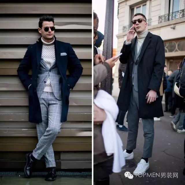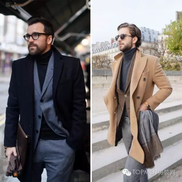 既然能搭西装能搭大衣,那么当西装和大衣在一起叠穿的时候,高领毛衣自然也是搞定无压力,本身叠穿看起来就比较有逼格,而高领毛衣简单的线条虽然看起来是化繁为简,反而更显质感。