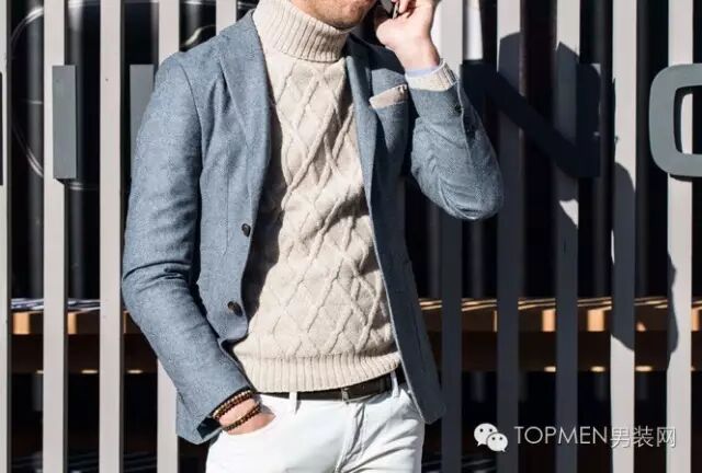 如果是休闲的西装夹克倒是可以试试绞花纹的毛衣,但前提都要是贴身的款式。