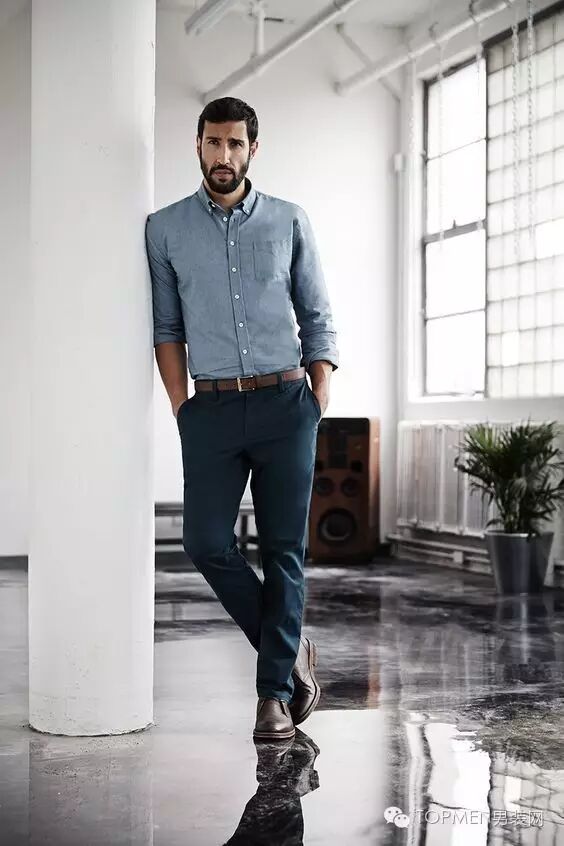 衬衫搭配九分休闲裤,一身深蓝色在棕色的衬托下显得更具活力。