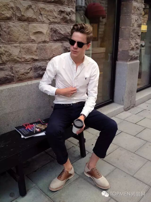 又或者搭配衬衫,其实衬衫跟素T有着异曲同工之妙,脚踩皮鞋、穿西裤比起一般所看到的传统式绅士风格有一种冲突性的叛逆感!