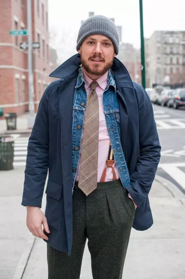 这么三个组合在一起的主要目的是为了什么?答案就是:暖。暖才是这套look最实际的作用。当然你可以在选款上多花些心思来让整体显得更有品味。比如经典的粉色衬衫、麦色针织套衫加藏青色外套,或者暗纹衬衫配带复古纹路的毛衣和大衣。