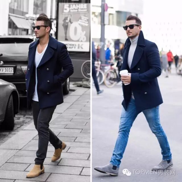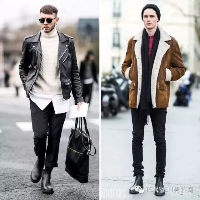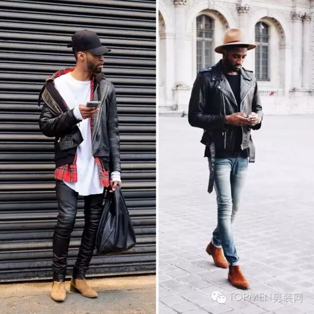 但是也不用觉得说麂皮靴就是很街头不够稳重,看看下面一位是皮面一个是麂皮,反倒是右边看起来更成熟,所以还是要看整体搭配,直筒的裤型就比窄腿的风格更正式。