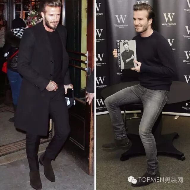 如果说哈卷代表的是嬉皮风,侃爷代表的是街头风,那么依旧说明不了切尔西靴的风格range有多宽,但是如果下面这个男人也都经常踩着切尔西靴出现那你绝对可以放心大胆地踩着去上班了,这个人就是行走的不老男神——小贝。