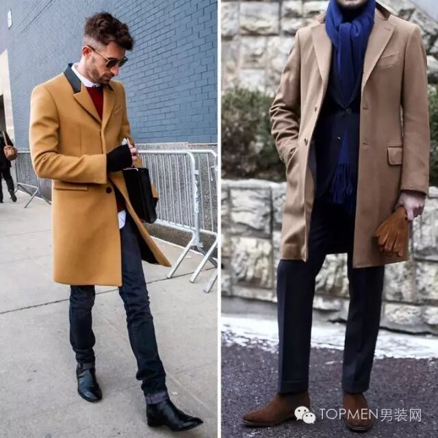而驼色大衣算是潮人最爱的麂皮切尔西拍档,怕驼色大衣成熟的可以试着加入牛仔单品。不过裤子还是都建议大家选择窄腿的。
