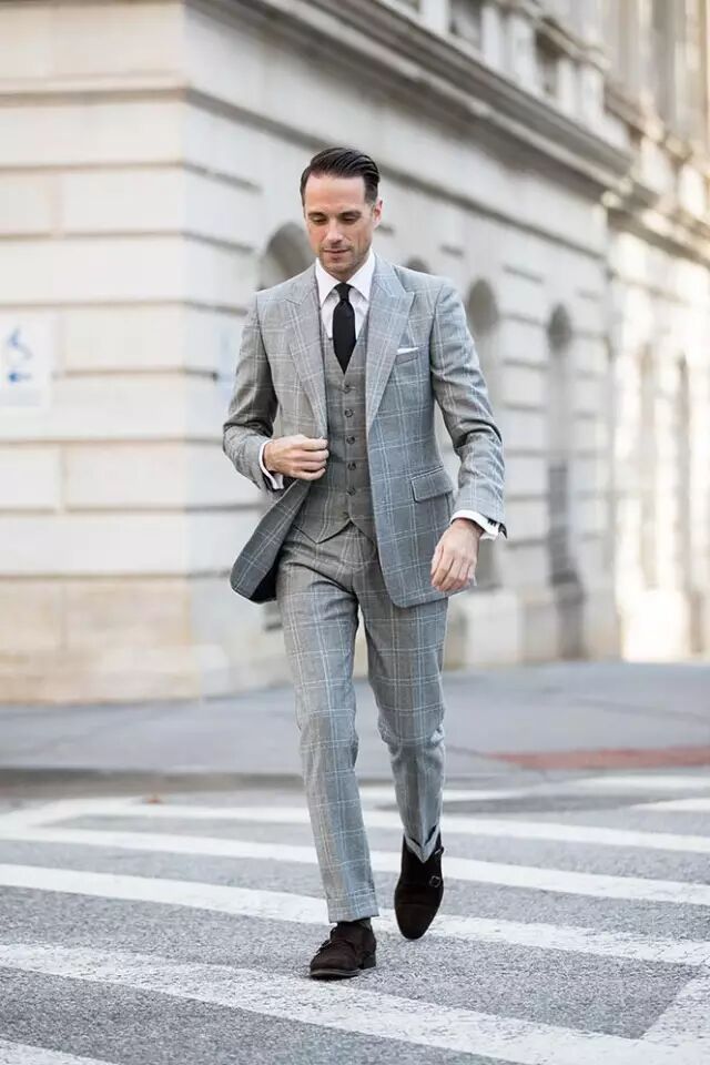 对于西装款式的选择,单排两粒扣的西装是最基础的,而黑、蓝、灰是我们一直推荐的颜色。