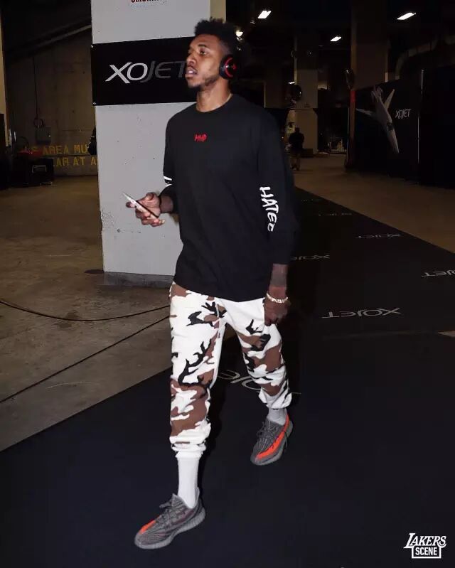 打球也要穿yeezy的尼克扬黑T配奶牛迷彩裤真的够swag,不过因为白色长袜过渡倒也没抢V2的风头。