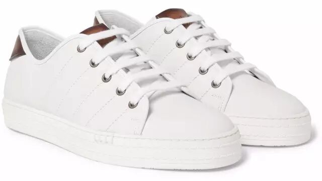 纪梵希的白色皮革运动鞋在鞋舌上有着金印logo,是纪梵希鞋款的独特设计。鞋底用了奶油色调,配合白色皮革鞋身一双现代即时髦的纪梵希小白鞋就完美呈现,穿着舒适,适合上班族,更适合与休闲西装搭配。这款球鞋定价为CNY¥3,515.71。