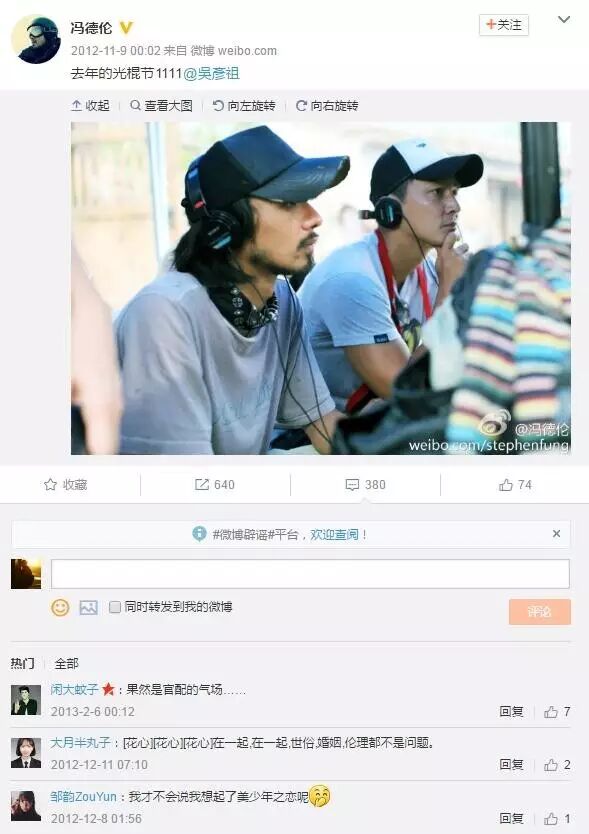而且他俩平时也基本不在公众场合秀恩爱,顶多在微博上互动一下。确实,这很冯德伦,低调自然做自己喜欢的。而我去到冯德伦微博看到的更多是他做导演时候的工作照,胡子拉碴,穿得很简单随性。