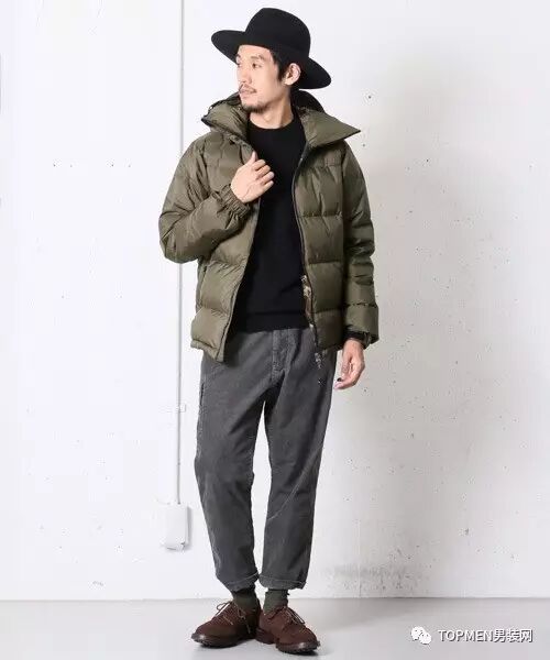 所以也别总是买那种黑色、深蓝色的羽绒服了,军绿色的就很不错啊,有男人味不说还很耐脏。像THE NORTH FACE的支线“THE NORTH FACE PURPLE LABEL”最近几年的秋冬系列都有推出军绿色的puffer羽绒服。
