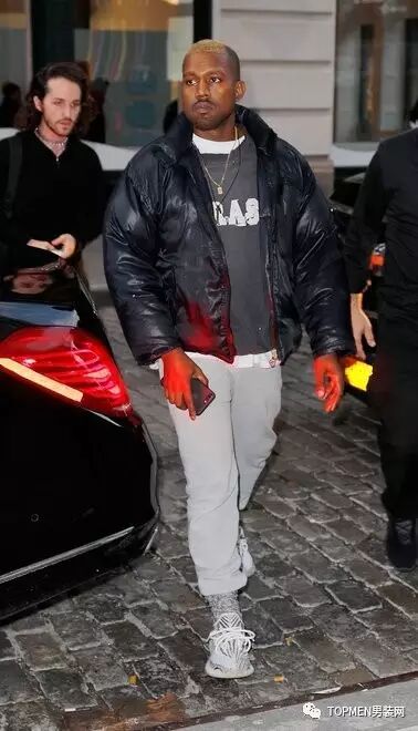最近一堆事儿的侃爷黑色puffer羽绒 灰色卫裤 灰色线袜 椰子,虽然人憔悴了点儿,但是衣品还是在线的。
