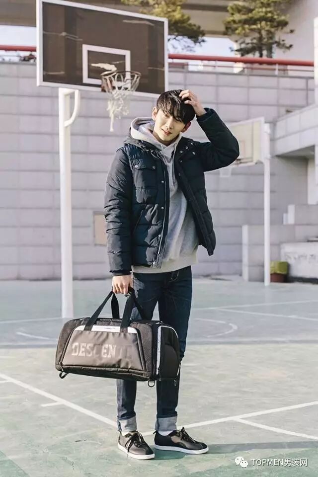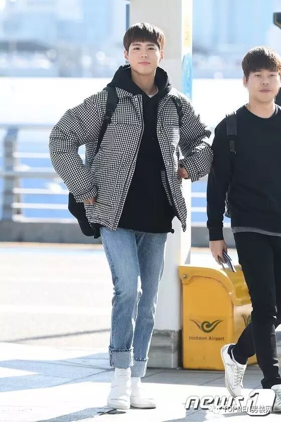 徐康俊这一身白色羽绒 浅色牛仔裤也是标准的韩系清新派穿搭。
