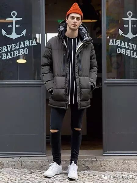 想要酷一点儿也可以选择破洞的黑牛,不过太冷就不要了。内搭一件T恤,再加上潮帽,潮男味儿十足。