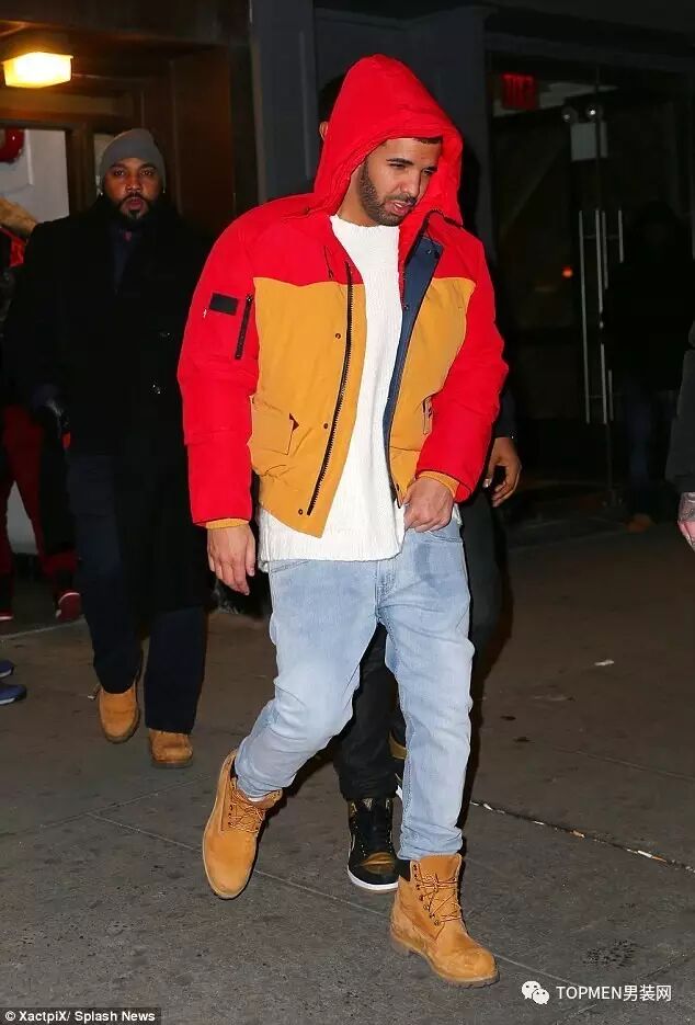 Drake白T牛仔大黄靴的青春,搭配一件亮色拼色的羽绒夹克,立马就能在人群中凸显出来。