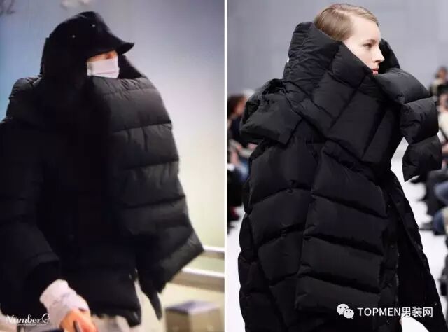 这让我想到了前段时间GD穿着下面这件Balenciaga羽绒服的机场图,再加上帽子和口罩,这样粉丝都能认出来,绝对也是真爱啊~