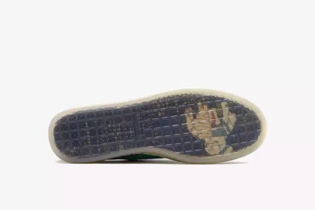 麂皮革面鞋身,有意思的是上面布满的捉鬼敢死队的报价和无鬼标志,采用了半透明鞋底,有红绿两种颜色可以选择。