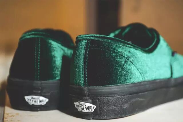 合作的独占款。鞋身整体采用了绿色丝绒材质打造,配上黑色的鞋带与做旧的鞋底,使得该鞋款散发出一种独特的复古奢华感。