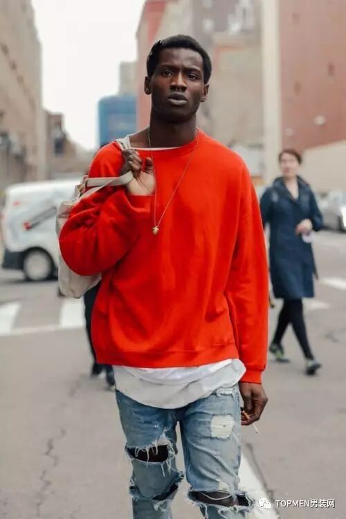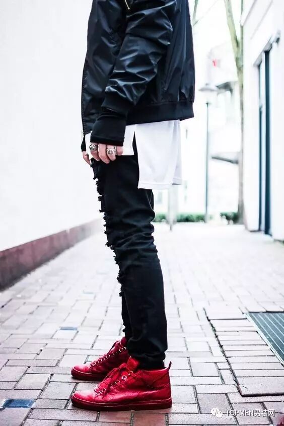 本身潮流单品风格相对来说就比较夸张,所以即使用到大红色也都不会违和,反而会更有个性,再配上黑色就更酷了。