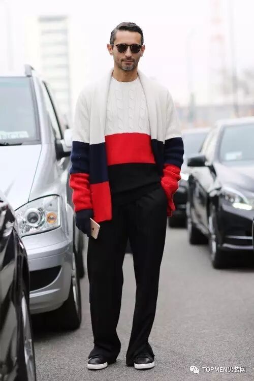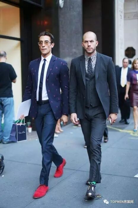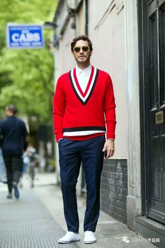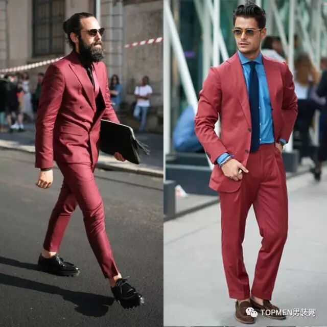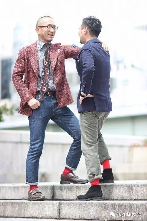 你还可以像下面两位小哥一样内搭红色的开衫也挺有趣的,还能保证够低调。