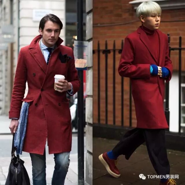 如果你对于红色还是有点儿犹豫,其实也可以试着选择一些可以替代正红的的颜色,比如饱和度较低的红色。像西装或者大衣这些风格比较成熟的单品就更适合这种红。