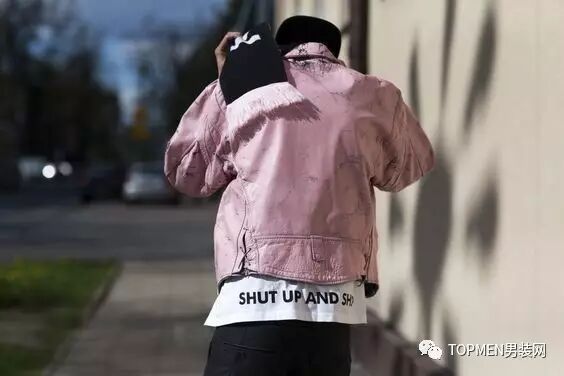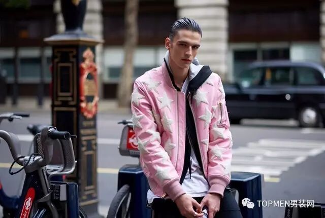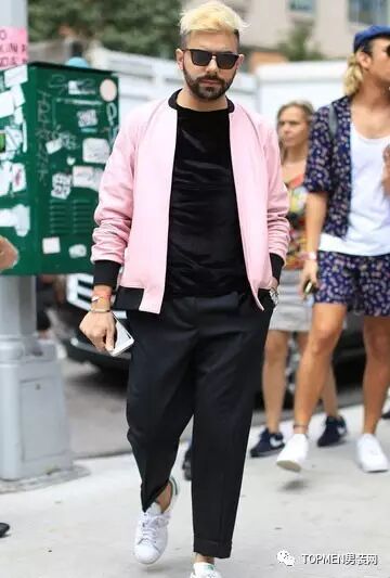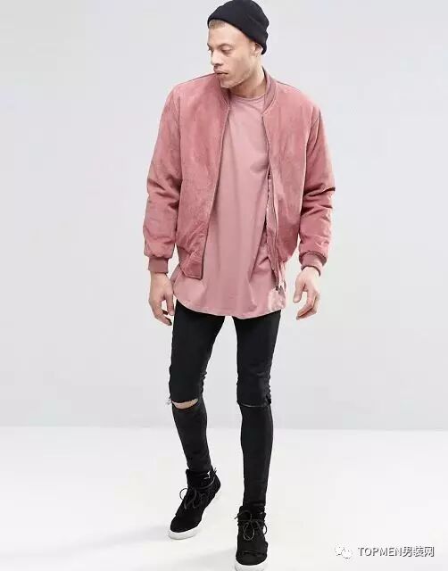 然后粉色夹克也是现在很多潮人都在穿的,搭配all black或者白T牛仔都是很保险的。