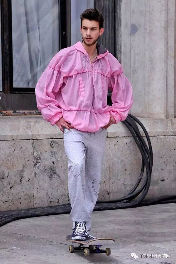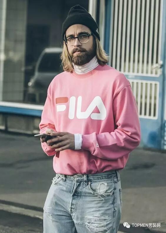 如果不知道怎么选,就选一件粉色卫衣吧。卫衣本身的运动风加上粉色之后也不会有过分女性化的情况,而且卫衣如今也是街头潮人的必备之物。