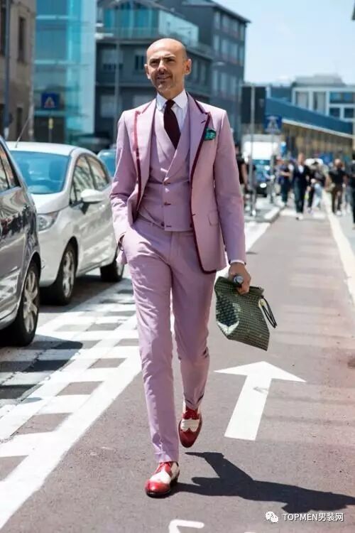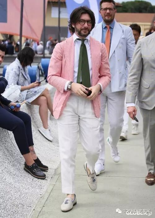 粉色西装是我们在pitti uomo的街拍中看得最多了,配上白色的裤子简直青春洋溢。