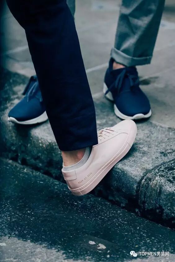 或者粉色的sneakers也是不错的选择,绝对够吸睛又还低调,配黑色的裤子就好。