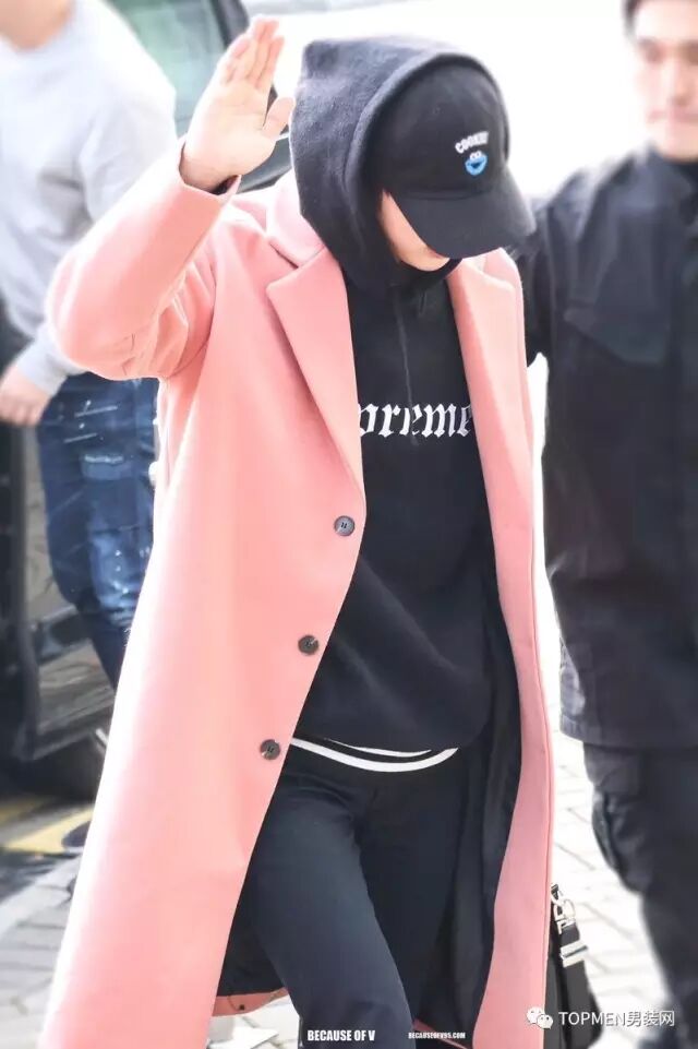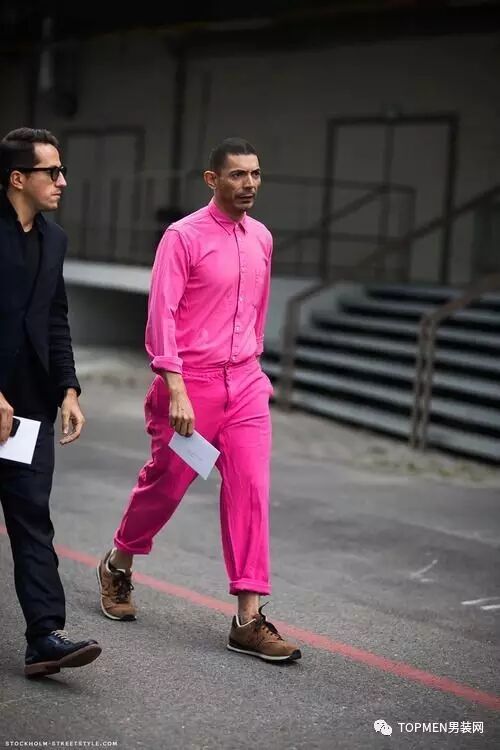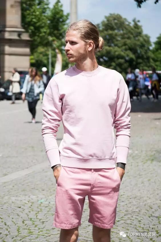当然,前者成套穿粉色不好看除了一些主观因素之外,还有一个很重要的原因就是他们选择了材质较软的面料。男士如果选粉色,最好还是选择线条简单,面料厚实有质感一些的单品。不然像下面这位一样就真有点儿娘了,虽然颜值还是在线的。