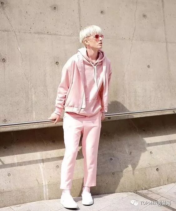 特别是连帽的卫衣,再外搭一件潮范儿十足的外套,是如今街头上比较常见的搭法,因为外套将粉色的面积缩小了,所以粉色就变成了点缀,既能达到不错的视觉效果,整个风格上也比较平衡。