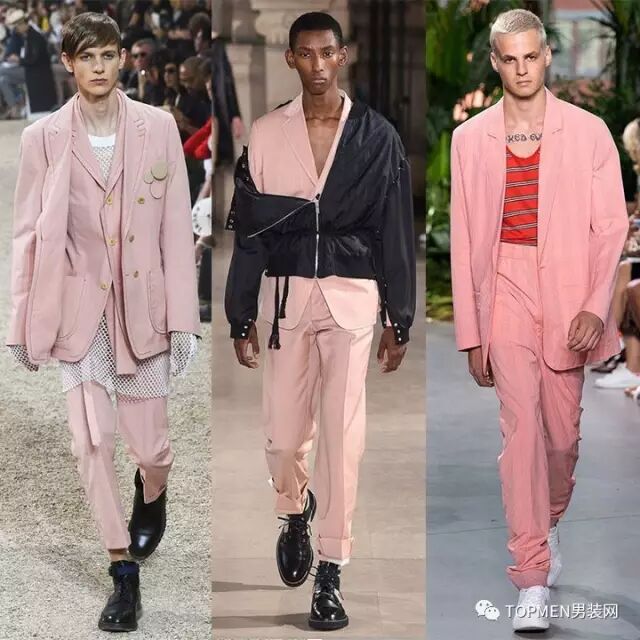 在这两季的男装秀场上,粉色早就不是什么稀有的东西,设计师大肆地把粉色加入了男装,而且还毫不忌讳地让模特们都成套的粉,融入西装之后赋予了粉色一种独特的男人味。