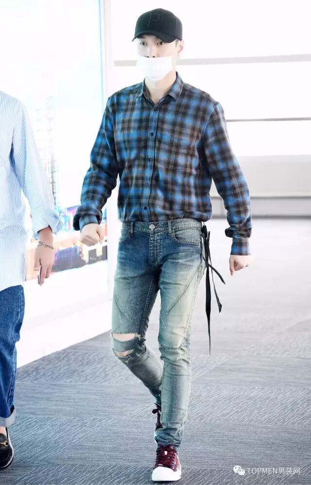 再来说说格纹的裤子,说实话虽然看到潮人在穿,实际上小编个人是不太建议选择格纹裤子的,线条很容易暴露你的腿部缺陷,还显胖。