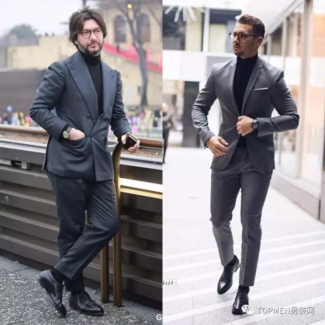 换成灰色套西 黑色高领毛衣 黑色皮鞋看起来就会更儒雅一些,而且熟男还是年轻男士都适合。