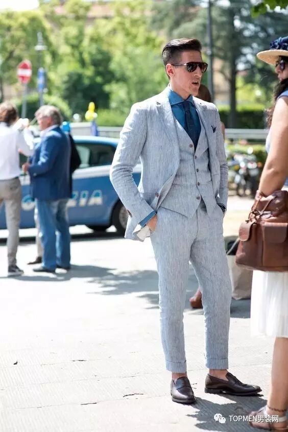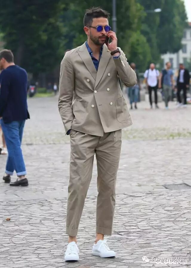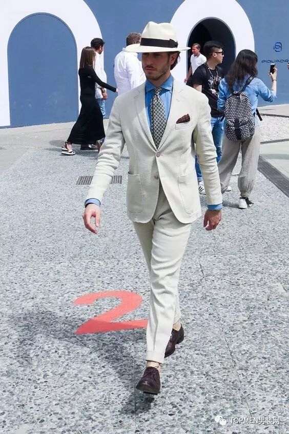 米色调已经是来到了白色的边缘,这种浅色的西装更适合春夏的时候穿着。都说白色和蓝色的组合是最适合这个季节的,同样这也能用在米色调的西装上。米色西装 浅蓝衬衫就会显得很fashion,鞋子可以稍微深色一点,选择棕色的皮鞋。