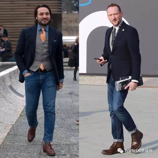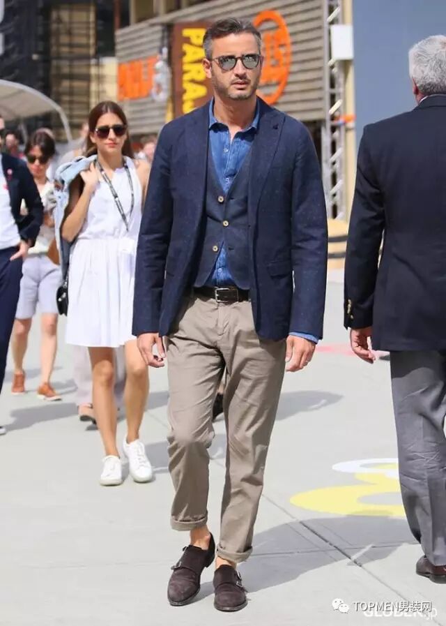 或者像下面这位一样,牛仔衬衫 卡其裤 磨砂皮皮鞋会给海军蓝西装更多的定义。
