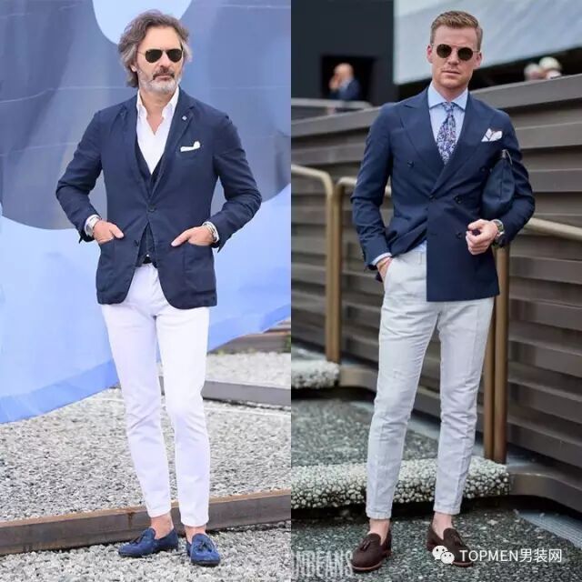 如果你还是钟爱绅士范儿,也可以把白色面积扩大到裤子,鞋子换成乐福鞋,这么穿就很清爽,适合春夏季节。
