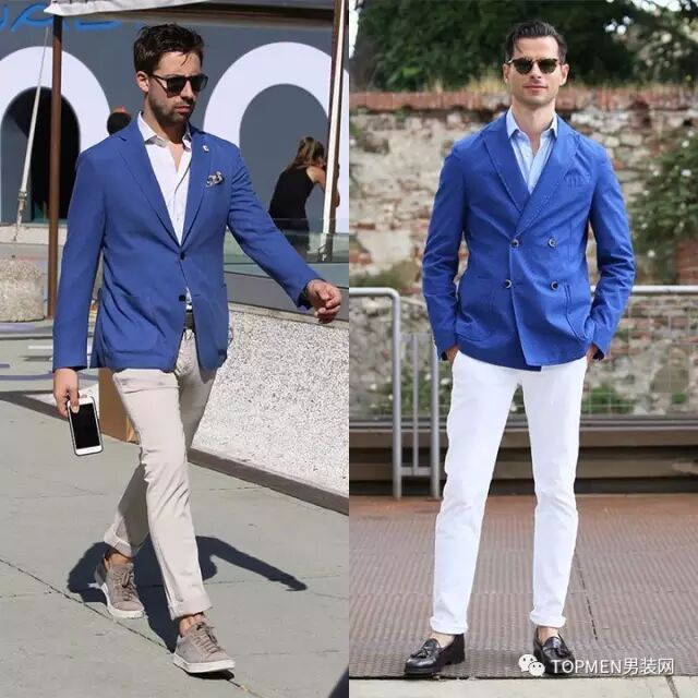 如果是轻熟男又想要打造休闲不羁的感觉,可以试着亮色海军蓝西装 衬衫打开一两颗纽扣 浅色直筒斜纹裤,在平时穿着也不会觉得突兀,还很显年轻。
