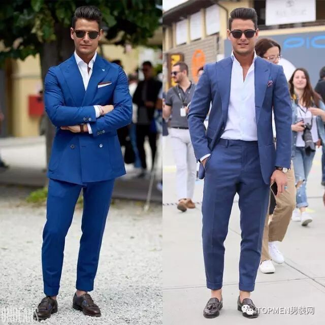而且如果你是比较成熟的男士又想穿出时髦兼具稳重,其实双排扣海军蓝西装是个不错的选择,下身一定要九分裤露脚踝,然后配上一双乐福鞋雅痞味十足。