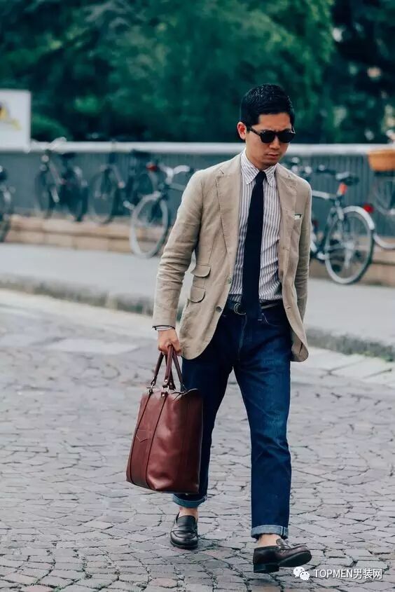 卡其西装 直筒卷边牛仔裤 深棕乐福鞋