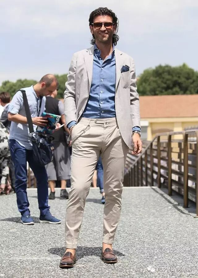 而灰色套西 牛仔衬衫则会让你看上去更时髦,这时候鞋子不用太吸睛,深棕或者黑色都可以。