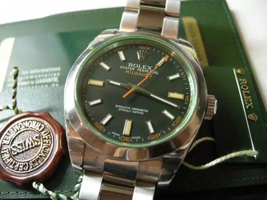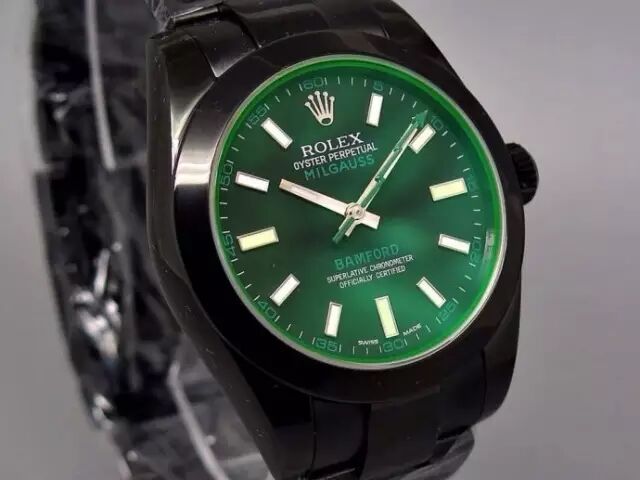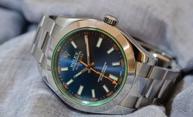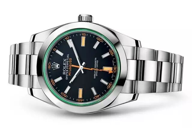 劳力士 Milgauss 采用了绿玻璃制成表镜,结合电光蓝色表盘,创造更活泼亮眼的视觉,从腕表正面看来镜面是透明无色,金属光泽的蓝色表盘跃入眼前,但从侧边就可看到镜面泛着特殊的绿色光泽,搭配有橘色闪电型秒针,以及大型夜光时标与橘色分钟刻度,强烈的色彩对比让这只表界的 科学怪人 愈发抢镜。
