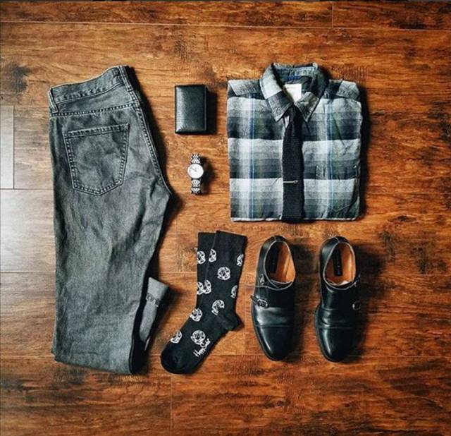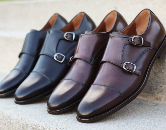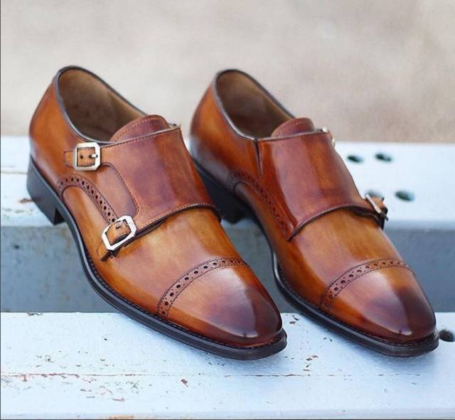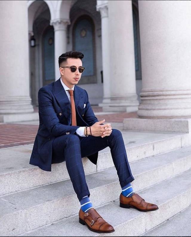 如果你翻遍了该博主的晒出的照片,你会发现他除了各种雕花皮鞋外,对孟克鞋是最热衷的。孟克鞋来源于15世纪,由阿尔卑斯山上的修道士设计出来,主要给僧侣们穿,由于牢固耐穿逐渐流传开来。孟克鞋分为单扣、双扣以及三扣,其中以双扣最为常见。素面的孟克鞋可以说是非常正式,如果加上雕花、褶裥或流苏也会变得别有味道,而博主 po 出的大多是拼接的雕花的鞋面,这样比较适合商务休闲风,属于商务便装的范畴。