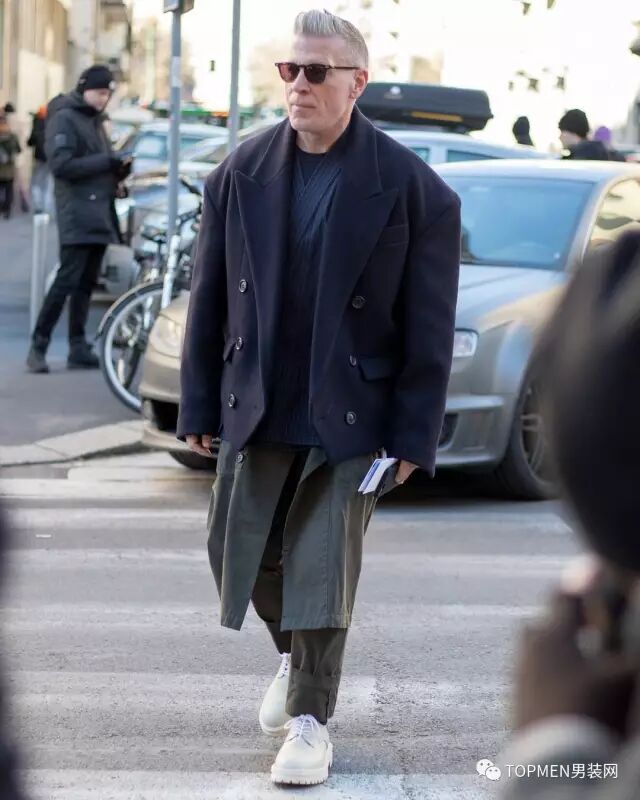 无论你属于哪种风格,展现出自己的腰线能从视觉上让你看起来更高大一些,特别是当你穿长外套的时候。如果像下面这种内搭全黑,整个人看上去就会有缩小的效果。