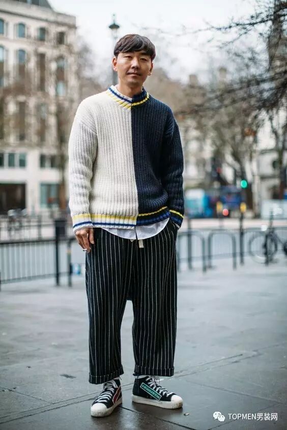 而下面这套选择的比较宽松的裤子,整个看起来就要小只很多,比例也会显得五五身。