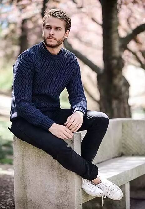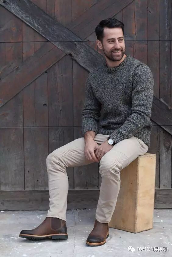 熟男一些的话也可以试试灰白或者黑灰夹杂的雪花粗针织毛衣,视觉上给人很有质感的感觉。