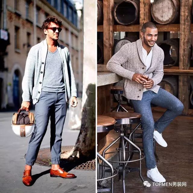 说到开衫顺带说一下如果你更保守,那么青果领的粗针开衫其实也能帮你营造一些暖男氛围的,特别是灰色和米色系的。