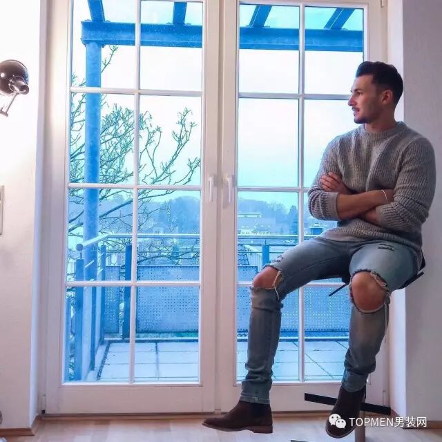 而风格更潮的年轻男生也是可以尝试窄腿的牛仔裤,比较街头的破洞也是可以的。