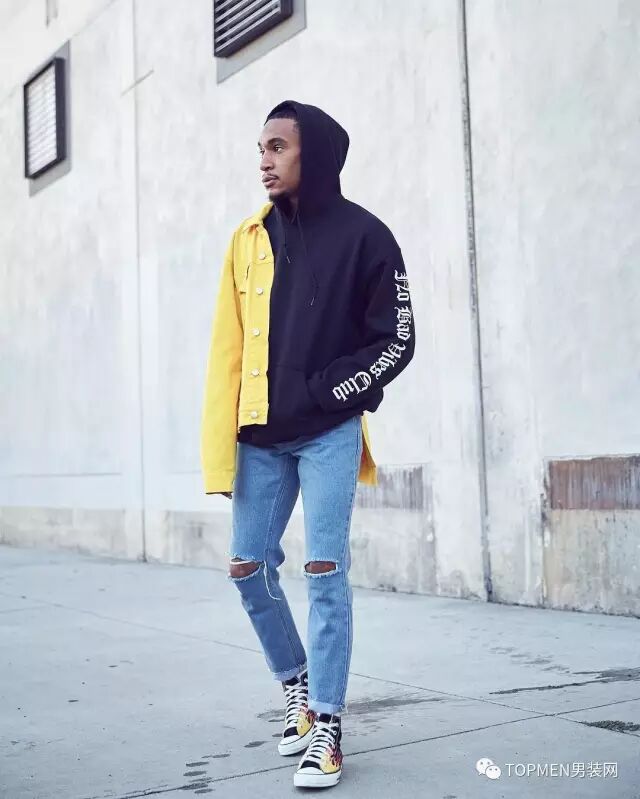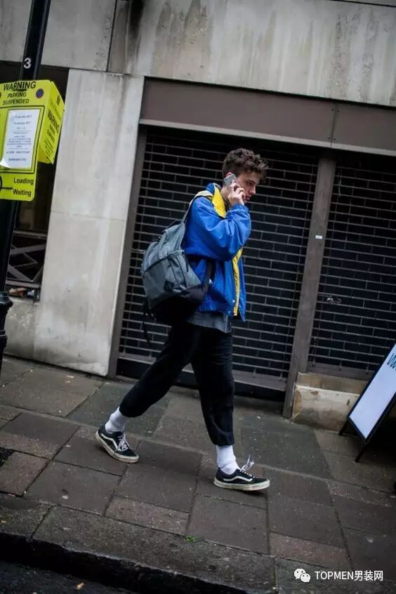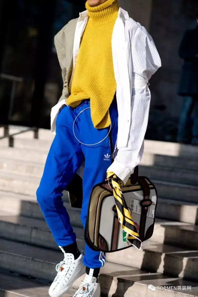 运动夹克也都可以来一波蓝色,而且还可以选亮度比较高的那种蓝,这会让你看上去很有活力。像下面两位一样在黑色中加点儿黄也不错,不过还是要用白色来综合一下下。