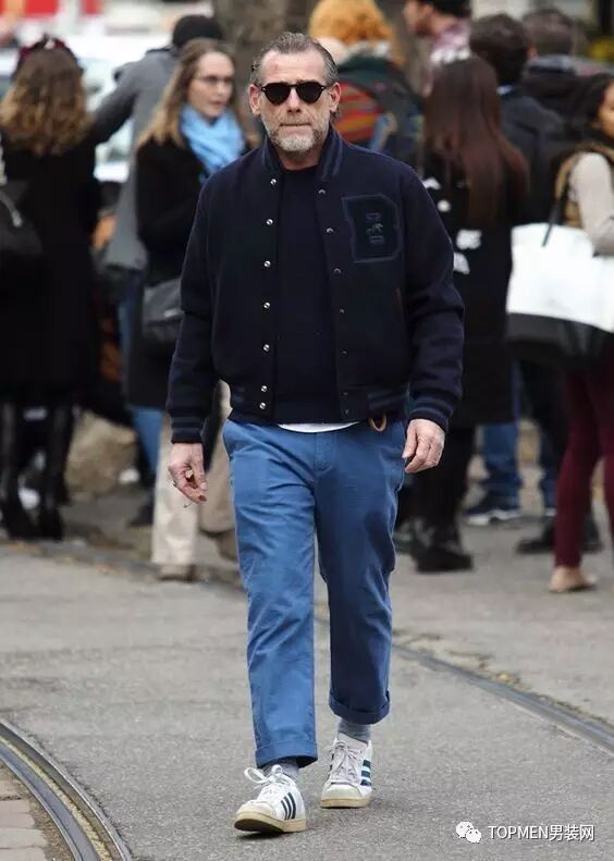 熟男们则可以试试下面两位大叔穿的这种同样饱和度较低的蓝色斜纹裤。也能透出点儿法式优雅来。而且配上短夹克和sneakers之后看起来年轻不少呢,同时也不失稳重。